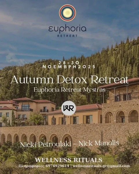 Για δεύτερη συνεχόμενη χρονιά έχουμε οργανώσει, σε συνεργασία με το βραβευμένο για τις υπηρεσίες του Euphoria Retreat, το φθινοπωρινό Detox Retreat μας στις 28-30 Νοέμβρη. Δημιουργήσαμε ένα διήμερο αποτοξίνωσης και ξεκούρασης με ειδικά διαμορφωμένα μαθήματα yoga και κινησιολογίας για να προκαλέσουμε και να βοηθήσουμε το σώμα μας να αποβάλει τις τοξίνες.